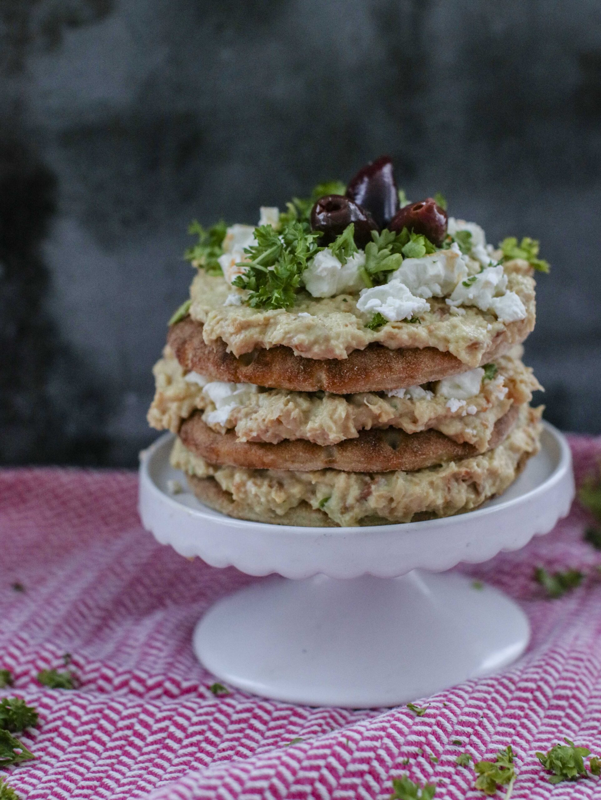 Aseta tarjoilulautaselle alimmaksi rieskanen, levitä sille 1/3 hummuskalatäytteestä ja 1/2 fetajuustosta. Laita päälle uusi rieska ja levitä sille taas 1/3 täytteestä. Aseta kolmas rieska kanneksi. Ripottele pinnalle vielä loput fetamurusta, vähän hienonnettua persiljaa ja oliivit kakun kruunuksi.